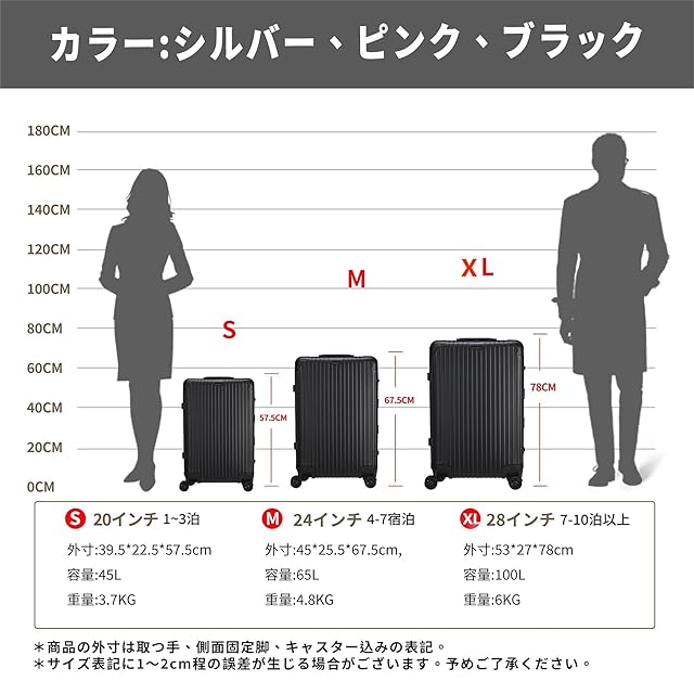 【サイズ】トランクケースのSサイズ: 外寸20インチ:約縦56.5×横39.5×奥行23.5cm(キャスター、取っ手含む)Sサイズはスーツケース 機内持ち込みサイズ、1~3泊に似合います。一部の航空会社だけに適用します、100席以上の国内線持ち込み可能で、事前に航空会社に確認したほうがいいんです。 Mサイズ:外寸24インチ:約縦67.5×横45×奥行25.5cm(キャスター、取っ手含む)4~6泊に似合います。Lサイズ:外寸26インチ: 約縦71×横46×奥行26.5cm(キャスター、取っ手含む)6-7泊に似合います。 XLサイズ:外寸29インチ: 約縦77×横51×奥行28.5cm(キャスター、取っ手含む)7泊以上に似合います。