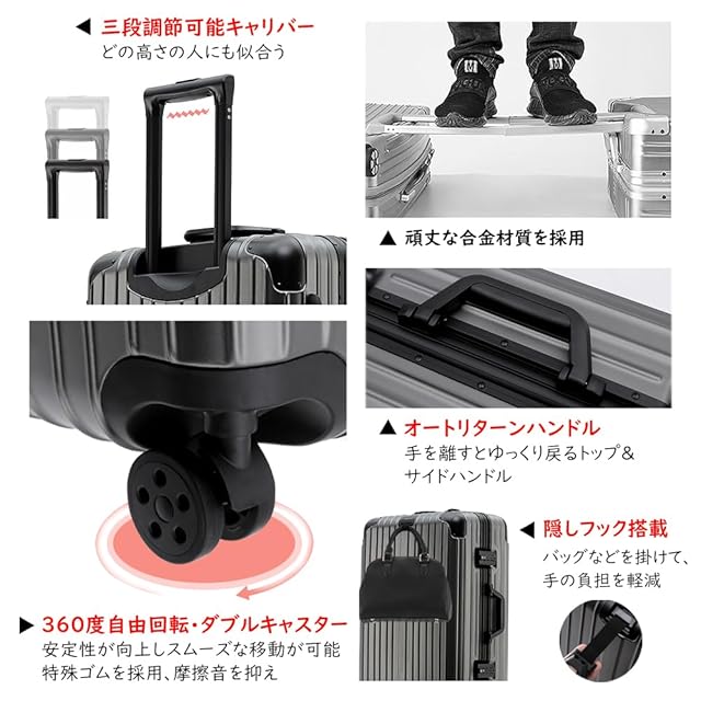 [Vilgazz] スーツケース キャリーケース アルミフレームタイプ 耐衝撃 キャリーバッグ 軽量 キャリーバック TSAロック 360度回転 ダブルキャスター 静音 大型 大容量 旅行 出張 Mサイズ 4-7泊 65L グレー