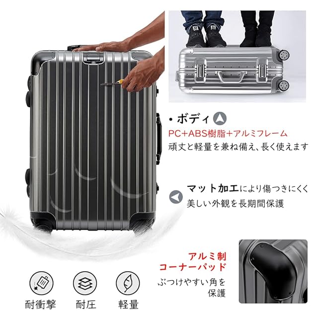 【PC+ABS樹脂+アルミフレーム】vilgazzキャリーケースは頑丈なボディと超軽量デザインが特徴です。さらに表面はマット加工で、傷つきにくいです。重量わずか3.65kgで、疲れずに持ち運べます。容量は44ℓ、1泊から3泊の短期旅行に十分な大きさです。
