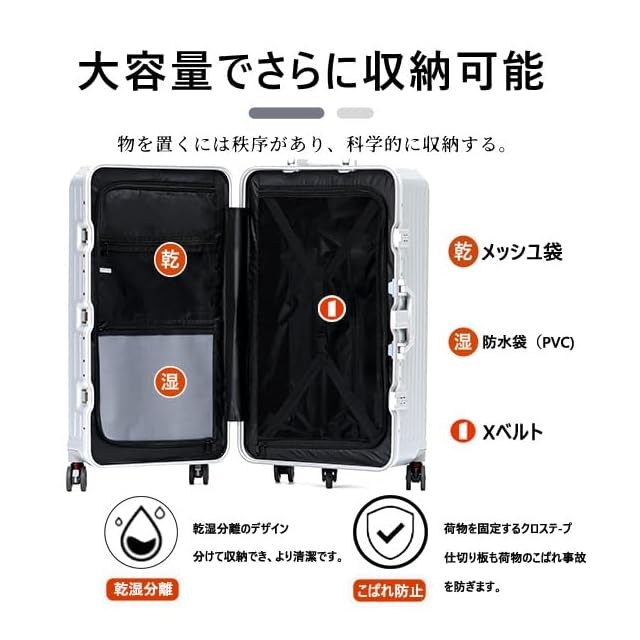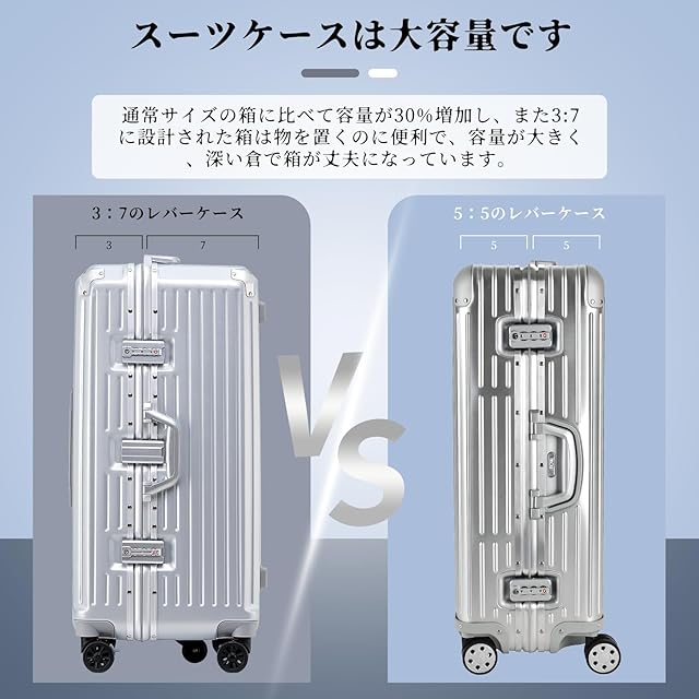 【革新的な3:7の型で スーツケース】収納スペースが、展開すると半分個づつの大きさのキャリーケースと違い、革新的な3:7の型で、深めの半分、ヘルメットや小型炊飯器、靴など、通常のスーツケースには入らない荷物も立てて入れられて、 もう片方に細かいモノを入れたりと、スッキリと収納が出来ます。インナーカバーがありますが、はずせばギリギリまで荷物を詰められます。乾湿分離のデザイン、分けて収納でき、よりきれいです。荷物の出し入れも便利に行えます。