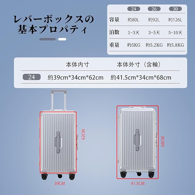 【スーツケースの仕様】キャスターを含めているサイズは以下です、24寸: 41.5cm*34cm*68cm。26寸: 41.5cm*35cm*73.5cm。30寸:45.5cm*37cm*85.5cm。キャスターを含めないサイズは以下です、24寸: 39cm*34cm*62cm,26寸: 39cm*35cm*67cm,30寸:43cm*37cm*78.5cm注意:手作業による測定のため、サイズは1~2cmの誤差がありますので、ご了承ください。