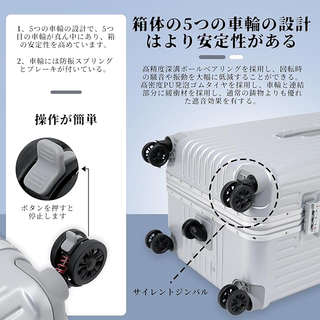 【新型5輪】5輪のキャスターで中央のキャスターがあるので、内容物を入れた際に重さを分散する様に中央のキャスターも地面にシッカリ接地して5輪で移動出来る様になっている仕組みが大変面白く実用性があります。振動防止スプリングとブレーキ付きホイール。ホイールには、スプリング振動防止機能とブレーキ機能があり、安全性を高めています。キャスターには輸入ゴム素材を使用し、低騒音システムを搭載、360°の回転が可能で、スムーズな走行と静音性を実現しました。