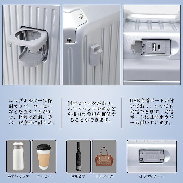 【三段調節キャリバー&柔軟ハンドル+ 移動式USBポート】超軽量のアルミニウム製キャリバー、高さ三段階調節、ご自分の身長に合わせてスムーズに調整が可能です。耐振性に優れるデザインで荷物を引きかける時、しっかりしています。また、滑りにくいソフトハンドルで長い時間の手提げでも手は疲れません。スーツケースはUSB、Type-c充電ポートがあります。スーツケースの内部にモバイルバッテリーを収納するポケットがついており、モバイルバッテリーを出し必要がありません、歩いながらスマホを充電することができます。また、充電ポートには防水カバーが付いているので、雨の日の旅行でも心配する必要はありません。