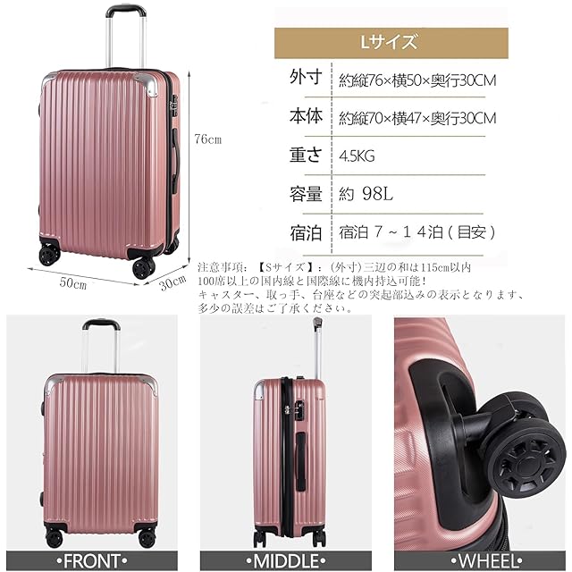 [TTOVALIGERIA]スーツケース キャリーケース 機内持ち込み キャリーバッグ 軽量 耐衝撃 大型 静音 360度回転 TSAロック搭載 ファスナータイプ 旅行 出張 入院(Lサイズ/98L/ローズゴールド)
