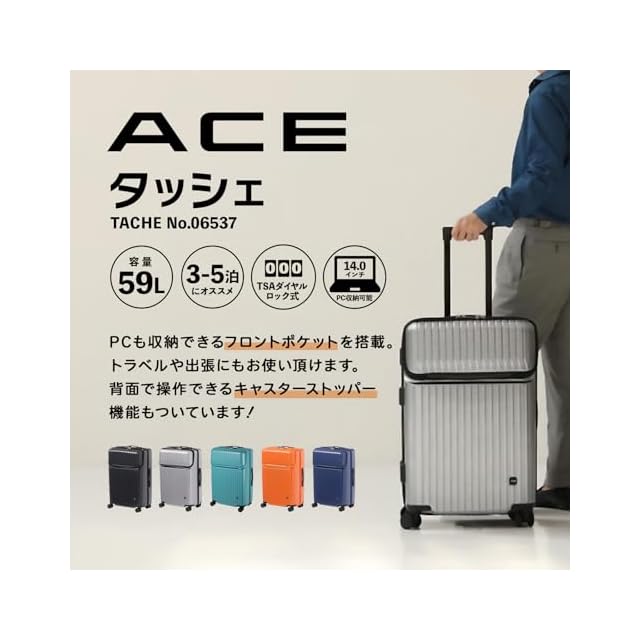 ACE(エース) スーツケース mサイズ 3泊4日 4泊5日 59L フロントポケット 14inch PC収納 キャリーケース タッシェ No.06537 ブラックカーボン