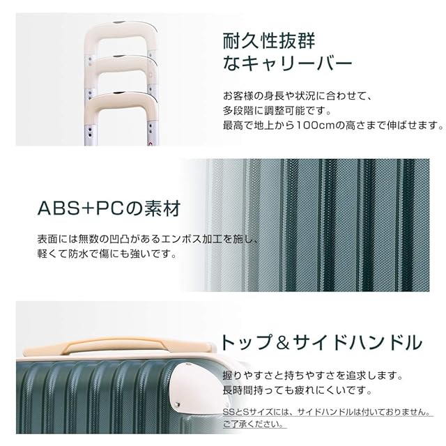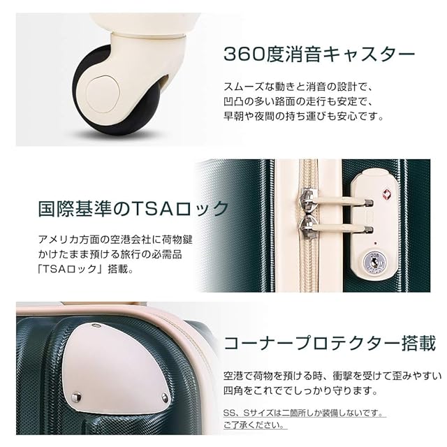 軽量なので重さ制限に有利で、女性の方でも軽々と持ち上げることができます。【TSAロック】海外旅行には欠かせない世界基準のダイヤル方式のTSAロックを採用しています、国内外にも関わらず、航空便をご利用する際に便利で、より安全で便利です。※ご注意:鍵は付いておりません。予めご了承ください。ご注意!!:SS、S、容量UP--SSと容量UP-Sサイズは寸法のため、側面のハンドルと底足が付いていません。そして、コーナープロテクトが二箇所しか装備しないです。