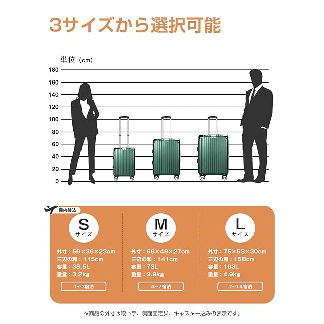 【改良されたアルミフレーム&ボディー素材】スーツケースは強化アルミフレームを採用し、従来のファスナータイプに比べ、高級感があって頑丈です。また、スーツケース本体の形状維持を強化させ、耐衝撃性と耐久性を向上させます。ボディーはABS樹脂とPCの混合素材で作られ、耐衝撃性に優れています。エンボス加工を施し、傷つきにくいです。