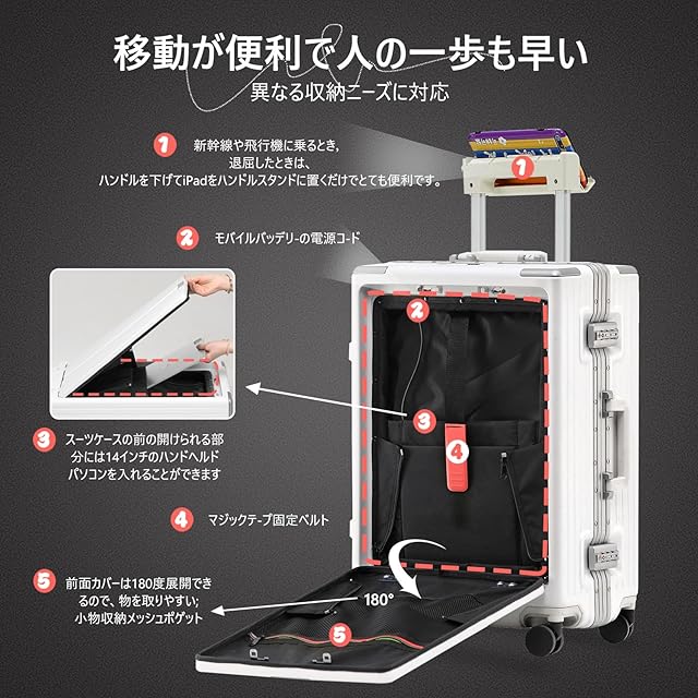 【便利で】新幹線や飛行機に乗るとき,退屈したときは、ハンドルを下げてiPadをハンドルスタンドに置くだけでとても便利です。そして、アルミフレームがあるので、飛行機や電車の待ち時間に疲れたら、スーツケースに座って休憩することもできます。