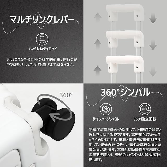 【材質&TSAダイヤル式ロック】スースケースはPC素材を採用し、耐衝撃性に優れた上、高弾性で、変形しにくい。エンボス加工、傷つきにくい。ABS素材より頑丈で耐久性に優れ、アルミフレームスーツケースより軽量で持ち歩きやすい。TSAダイヤル式ロックが搭載されて、外出がより安全。また、鍵穴は航空会社検査専用の物です。本製品に鍵は付属しておりません。