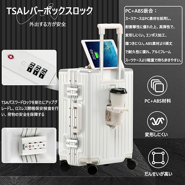 【カップホルダー+サイドフック+ 移動式USBポート】スーツケースの背面にカップホルダーがあり、飲み物、傘などの小物を簡単に取り出せる。折りたたみ可能なデザインは外観に影響を与えません。サイドにフックが付いているので、ハンドバッグやギフトバッグなどの荷物を掛けることができ、旅行時の負担を軽減します。スーツケースはUSB、Type-c充電ポートがあります。スーツケースの内部にモバイルバッテリーを収納するポケットがついており、モバイルバッテリーを出し必要がありません、歩いながらスマホを充電することができます。また、充電ポートには防水カバーが付いているので、雨の日の旅行でも心配する必要はありません。