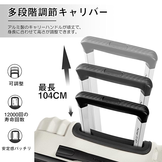 【多段調節キャリーバー&握りやすい2層ハンドル】アルミ合金製の超軽量のキャリバーは伸縮可能で、ご自分の身長に合わせて、最適な高さに調節できます。2層式で設計されたハンドルは、手に当たる部分に柔らかい素材を使用しており、荷物を入れた状態でも手に食い込みにくく長時間持っていても手が痛くなりにくいのが特徴です。