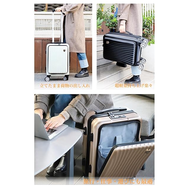【フロントオープン&USB充電ポート付き】立てたまま荷物の出し入れができる便利なフロントオープンスーツケースです。15.6インチまでパソコンやタブレット、パスポートなど荷物に合わせた細かなポケットがあり、空港や新幹線の中、旅の途中でも、前ポケットから出したいものを簡単に取り出すことができ、子連れの方やビジネスシーンでも活躍しています。便利なUSB充電ポート付き、場所を選ばずいつでもどこでも移動しながら効率よく充電ができます。