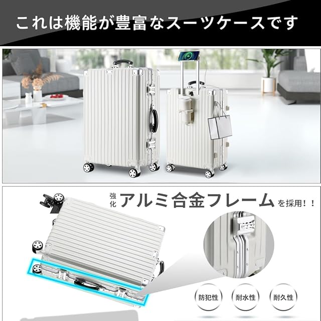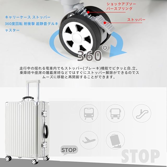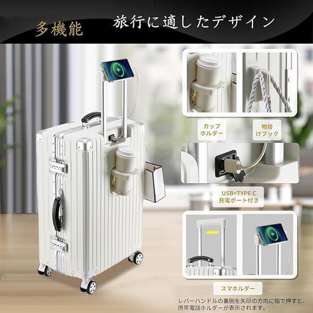 【多機能・キャスター ストッパー付き ・USB+Type C充電ポート付き ・カップホルダーとスマホルダーを付く】走行中の揺れる電車内でもストッパー(ブレーキ)機能でピタっと自立。乗降時や座席の離着席時などではすぐにストッパー解除ができるのでスムーズに移動を再開することができます。スーツケースにモバイルバッテリーを収納するポケットがついており、 USB+Type Cポートの充電口が外にあることで、いつでもどこでも充電できます。便利な折りたたみ式ドリンクホルダー付き。バックカップホルダー、ミルクティーカップ、傘いつでも配置でき、旅行をより便利にすることができます。レバーの上部にはスマホルダーが付いているので、フライトの待ち時間に両手が自由になり、外出先でもリラックスできます。