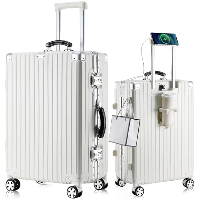 [SnooII] アルミフレーム+軽量化皮革ハンドル+ブレーキ付きキャスター+水筒ホルダー+フックデザイン+USB 充電ポート スーツケース キャリーケース 多機能 付き ストッパー付き キャリーバッグ 携帯スタンド USBポート付き カップホルダー付き 隠しフック機能 超軽量 耐衝撃 静音 360度回転 (ホワイト, M サイズ(65L))