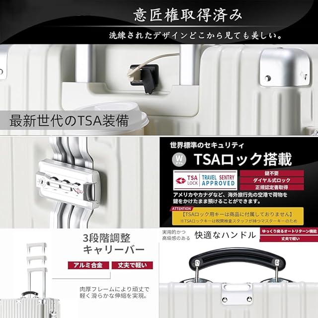 【世界標準のTSAロック&アルミニウム製レバー&360°静音ブレーキ付きホイール】20インチの搭乗可能なスーツケースには、最新の最先端技術である携帯電話充電機能付きTSA税関ロックが搭載されており、ボタンを押すとスーツケースの前面開口部の蓋が開きます。20インチ、24インチ、27インチには世界標準のTSAコンビネーションロックが搭載されており、非常に頑丈なので、スーツケースの使用中や運搬中にスーツケースが破損したり、欠けたりする心配がありません。 アルミニウム製トロリーバーは、丈夫で軽量、錆びない最高のトロリーバー素材です。360°静音ブレーキ付きホイール(ブレーキパッド装備),走行中の揺れる電車内でもストッパー(ブレーキ)機能でピタっと自立。乗降時や座席の離着席時などではすぐにストッパー解除ができるのでスムーズに移動を再開することができます。