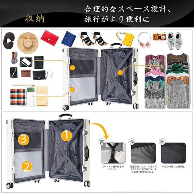 【丈夫かつ軽量PC素材&TSAダイヤル式ロック】表面素材は高耐衝撃性を持つPC(ポリカーボネート)を100%使用。高弾性で、変形しにくい。小さな傷などは正規品の範囲内でしています。世界基準のTSAダイヤル式ロックが搭載されて、外出がより安全に。※鍵は航空会社検査専用のため本製品には付属しておりません。パスワードの設定方法については、メインビデオをご覧ください。ロックが開かない場合は、当社までご連絡ください。