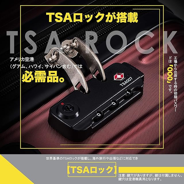 【TSAロック】世界基準施設TSAロックが搭載し海外旅行や出張などに対応 。工場から出荷する時の初期パスワードは「000」です。アメリカ空港(グアム、ハワイ、サイパン含む)では必需品。警告:こちらのタイプのTSAロックはダイヤル式です。鍵穴がありますが、鍵は付属しません。鍵穴は空港職員用となります。