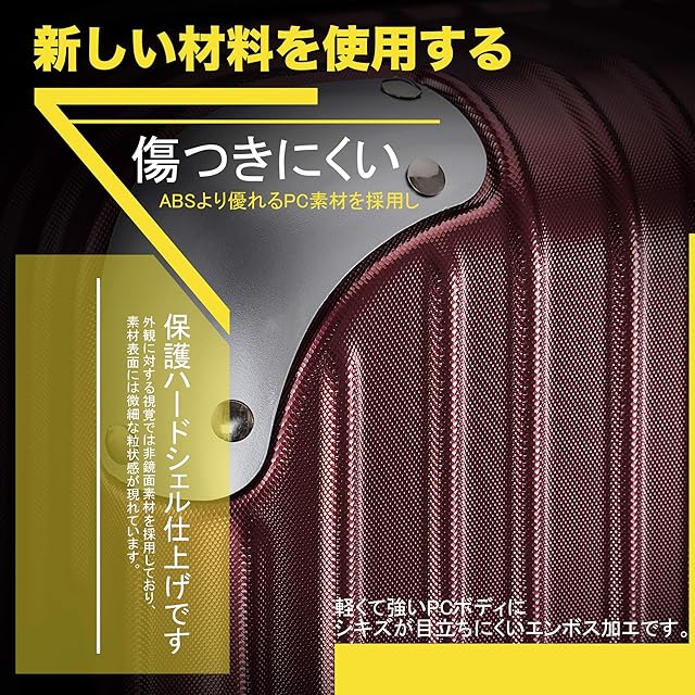 【新レベルアップ】新製品には新素材を採用しておます。視覚では外観には非鏡面素材を採用しており、素材表面には微細な粒状感が現れています。注意 正面の隠しボタンも廃止しました。傷つきにくい保護ハードシェル仕上げです、ABSより優れる素材PCを採用します、軽くて強いPCボディにキズを目立ちにくくするエンボス加工。