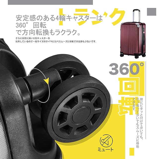 【消音設計キャスター】消音キャスターで早朝や夜間の持ち運びも安心です。ダブルキャスターは操作性のスムーズな360度回転12輪独立サインレントキャスターです。