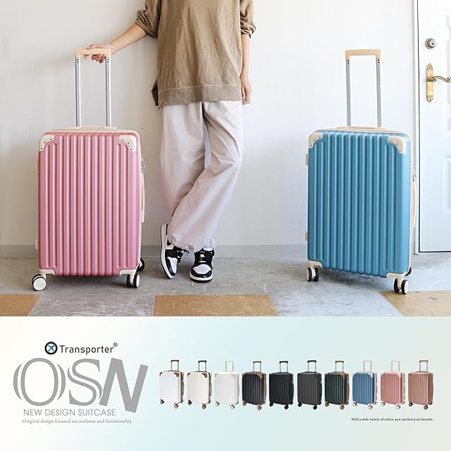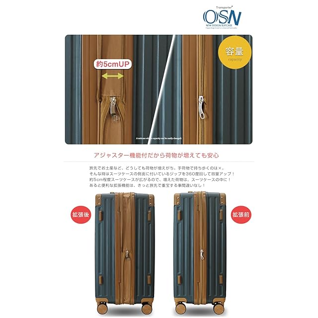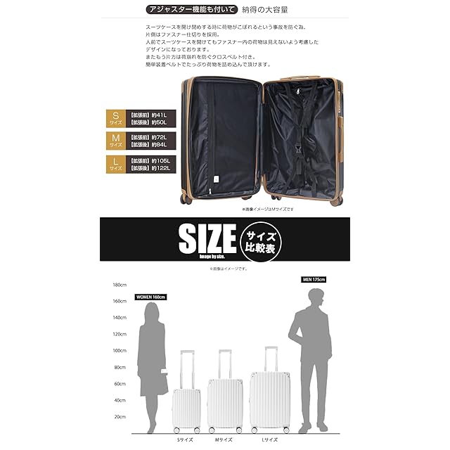 全体サイズ:【スーツケース Sサイズ】約横幅36.5×高さ53.5×奥行22.5cm(拡張後+約5cm) 機内持ち込み、【スーツケース Mサイズ】約横幅43×高さ64×奥行26cm(拡張後+約5cm)、【スーツケース Lサイズ】約横幅48.5×高さ73.5×奥行31cm(拡張後+約5cm) ※全体サイズは車輪や持ち手など全て含めた値です。