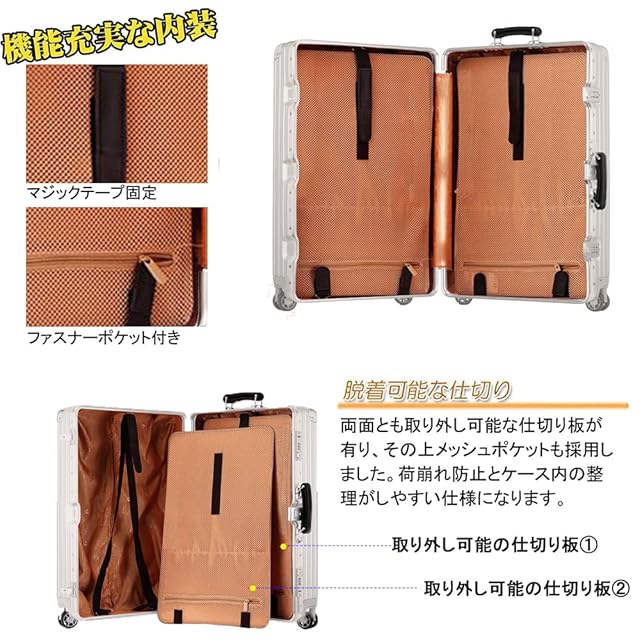 【内部収納に便利】トランクケースの収納能力が非常に高く、初心者の方から旅慣れた方まで幅広くご利用頂けるスーツケースです、耐久性には優れて丈夫です、長持ちできます。それから、荷物を固定するクロステープがあります。仕切り板も荷物のこぼれる事故を防ぎます。大容量の時にキャリーで安いです。