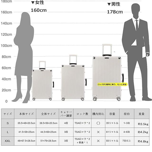 【サイズ】Sサイズの内寸は48*35.5*20.5cm、容量は35リットル、1~3泊に似合います。Sサイズは一部の航空会社だけに適用しますので、事前に航空会社に確認したほうがいいんです。Mサイズの内寸は50*38.5*22.5cm、容量は48リットル、2-4泊以上。Lサイズの内寸は41.5*58*25cm、容量は61リットル、4-6泊以上。XLサイズの内寸は62*45.5*26.5cm、容量は78リットル、5-7泊以上。XXLサイズの内寸は67.5*48*28.5cm、容量は93リットル、7泊以上