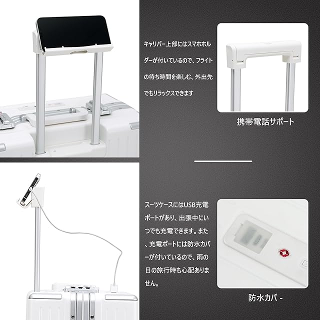 【カップホルダー+サイドフック+ 移動式USBポート】スーツケースの背面にカップホルダーがあり、飲み物、傘などの小物を簡単に取り出せる。折りたたみ可能なデザインは外観に影響を与えません。サイドにフックが付いているので、ハンドバッグやギフトバッグなどの荷物を掛けることができ、旅行時の負担を軽減します。スーツケースはUSB、Type-c充電ポートがあります。スーツケースの内部にモバイルバッテリーを収納するポケットがついており、モバイルバッテリーを出し必要がありません、歩いながらスマホを充電することができます。また、充電ポートには防水カバーが付いているので、雨の日の旅行でも心配する必要はありません。