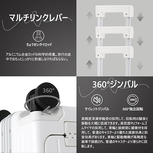【材質&TSAダイヤル式ロック】スースケースはPC素材を採用し、耐衝撃性に優れた上、高弾性で、変形しにくい。エンボス加工、傷つきにくい。ABS素材より頑丈で耐久性に優れ、アルミフレームスーツケースより軽量で持ち歩きやすい。TSAダイヤル式ロックが搭載されて、外出がより安全。また、鍵穴は航空会社検査専用の物です。本製品に鍵は付属しておりません。