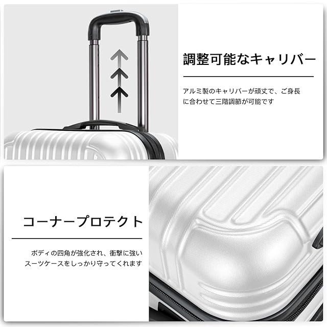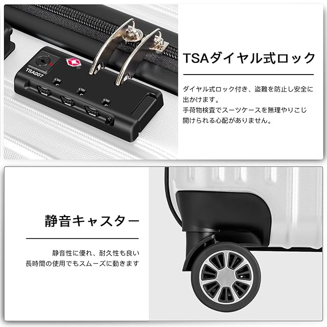 【材質&TSAダイヤル式ロック】スーツケースはABS樹脂とPCでの混合素材で作られ、耐衝撃性に優れた上、高弾性で、変形しにくい。エンボス加工、傷つきにくい。アルミフレームスーツケースより軽量で持ち歩きやすい。TSAダイヤル式ロックが搭載されて、外出がより安全。また、鍵穴は航空会社検査専用の物です。本製品に鍵は付属しておりません。