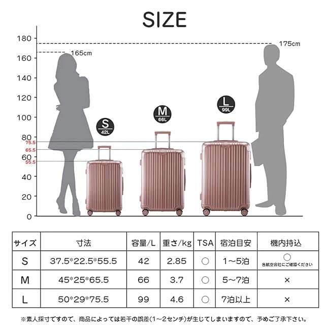 【サイズ 安心の一年修理】○Sサイズ (幅×奥行×高さ) 37.5cm x 22.5cm x 55.5cm 本体重量:約2.85kg(付属品含まず)容量:約42L(2~3泊対応)○Mサイズ (幅×奥行×高さ) 45cm x 25cm x 65.5cm 本体重量:約3.7kg(付属品含まず)容量:約66L(3~5泊対応)○Lサイズ (幅×高さ×奥行) 50cm x 29cm x 75.5cm 本体重量:約4.6kg(付属品含まず)容量:約106L(6泊以上対応)※ 多少の誤差はご了承ください○1年・日本語説明書