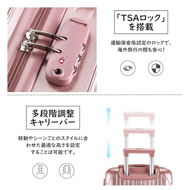 【段階調節可能なキャリーバー TSAナンバーロック】ボタン一つでキャリーバーの高さを調節できます。三段階調整可能ハンドル キャリーバー耐久性抜群 男性でも女性でも使いやすい、調整ハンドルを採用。TSAロックも装備されていて、海外旅行にもピッタリ。3桁のナンバーロックを使用し、鍵をなくす心配はありません。