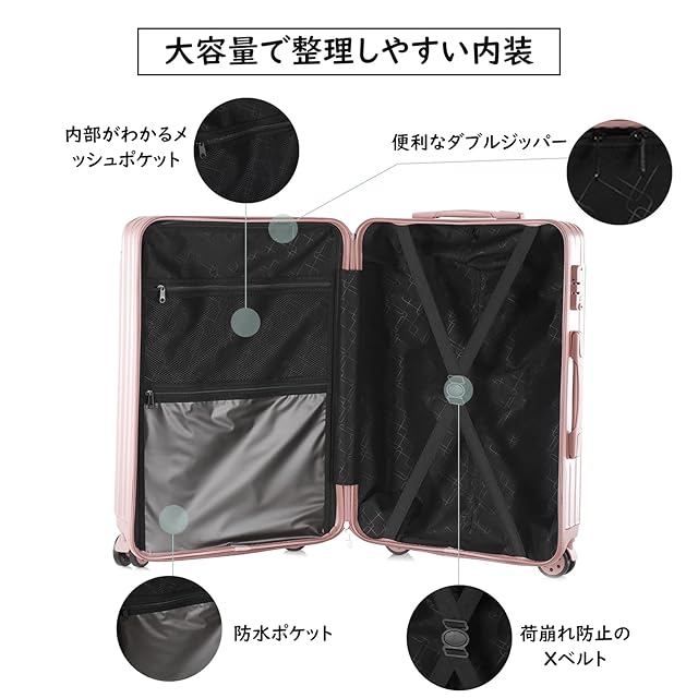 [ISUKI] スーツケース キャリーケース キャリーバッグ 機内持込 ファスナー 超軽量 ジッパー 耐衝撃 人気 360度回転 静音ダブルキャスター TSAローク搭載 旅行出張 ビジネス ピンク Pink Mサイズ 約66L