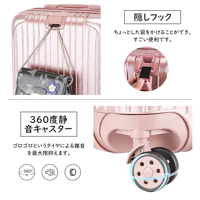 【隠しフック コーナーパッド】滑りにくいソフトハンドルで長い時間の手提げでも手は疲れません。隠しフックが搭載されており、バッグなどを掛けて、旅行中の手への負担を軽減します。コーナー部分にパッドを装備することで、衝撃を受けやすい角をガードできます。