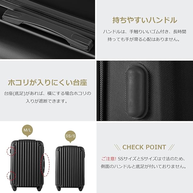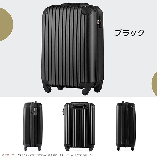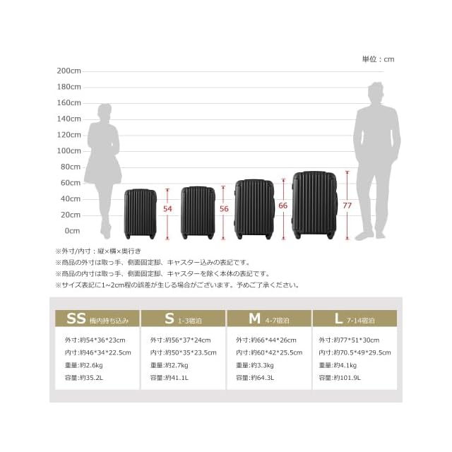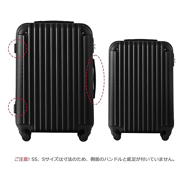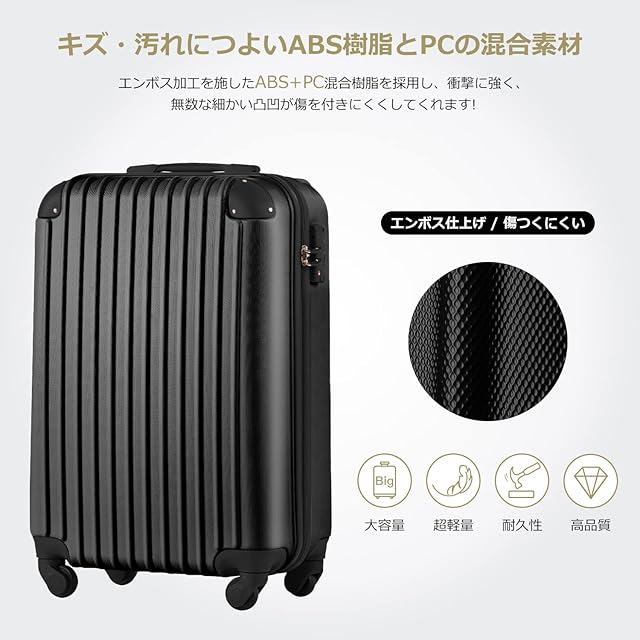 【サイズ】 SSサイズ(機内持込) 外寸:約52.5x34.5x22.5cm 内寸:約47x33.5x20cm 重量:約 2.65 kg 容量:約 31.4L 1~3泊に似合います。 Sサイズ 外寸:約37x56x24cm 内寸:約35x50x23cm 重量:約 2.8 kg 容量:約 40.2L 1~3泊に似合います。 Mサイズ 外寸:約65x43x26cm 内寸:約58x41.5x26cm 重量:約 3.3kg 容量:約 62.6L 4~7泊以上。 ※Sサイズは一部の航空会社だけに適用しますので、事前に航空会社に確認したほうがいいんです。 【表面素材】スーツケースはABS樹脂とPCでの混合素材を採用しており、純ABS樹脂より耐衝撃性に優れています。エンボス加工、傷つきにくい。縦縞デザインにより、シンプルかつファッションです。超軽量で携帯便利、女性でも楽々に持ち出かける人気なキャリーケースです。