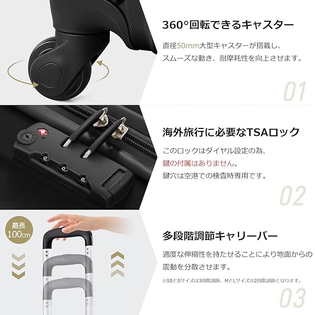 【TSAロック&5年間品質】ファスナータイプではなく、旅行箱は世界基準施設TSAロックを搭載するので、施錠したままで預けることができて、トラベルに安心できます。本体の鍵穴はTSA職員の検査用ですので、お客様には付属の鍵はございません。本製品には5年間品質を提供します。使用中に何か問題があれば、商品を開封しても、お気軽にお問合わせてください。