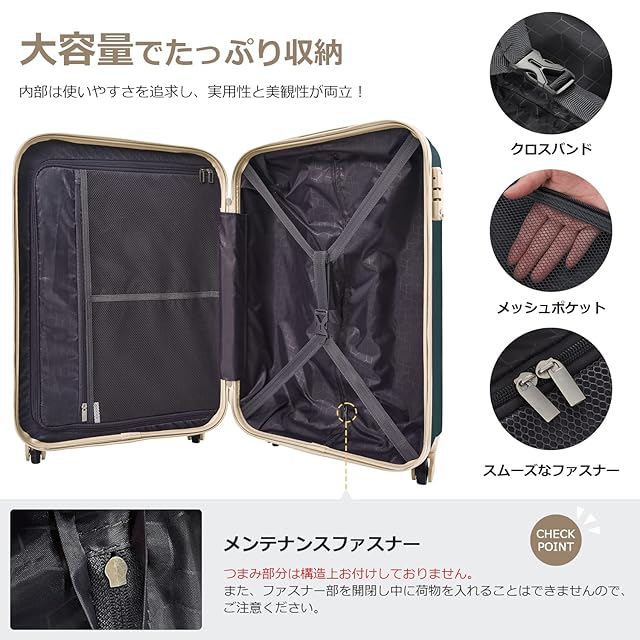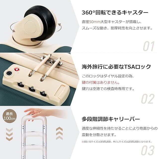 【TSAロック&5年間品質】ファスナータイプではなく、旅行箱は世界基準施設TSAロックを搭載するので、施錠したままで預けることができて、トラベルに安心できます。本体の鍵穴はTSA職員の検査用ですので、お客様には付属の鍵はございません。本製品には5年間品質を提供します。使用中に何か問題があれば、商品を開封しても、お気軽にお問合わせてください。