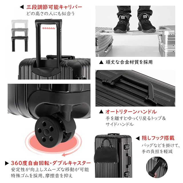 【多機能性キャリーバッグ】アルミ製のキャリーバーが頑丈で、高さは3段階調節、ご自分の身長に合わせてスムーズに調整が可能です。また、四つの角を傷や衝撃から保護ため、アルミ制コーナーパッドを採用しております。さらに、隠しフック搭載し、バッグなどを掛けて、手の負担を軽減します。