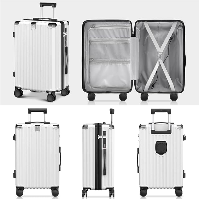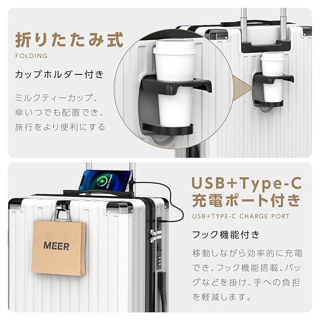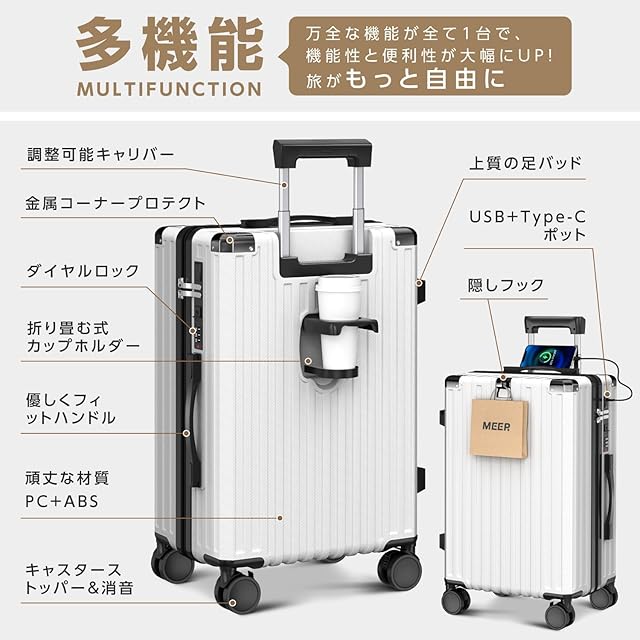 [meer] スーツケース キャリーケース キャリーバッグ キャスターストッパー付き Type-C&USB充電ポート ABS+PC 耐衝撃 機内持込 耐衝撃 静音 ブレーキ機能 カップホルダー 隠しフック 360度回転 ファスナータイプ スマホスタンド 大容量 大型 旅行 ビジネス 出張 修学 泊まる 入院
