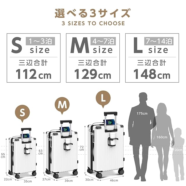 【多段調節キャリバー&USB&Type-C充電ポート】アルミ合金製の超軽量のキャリバーは伸縮可能で、ご自分の身長に合わせて、最適な高さに調節できます。また、 キャリバッグ は便利なUSB&Type-C充電ポート付き、場所を選ばずいつでもどこでも移動しながら効率よく充電ができます。【5カラー・3サイズ】Sサイズ(機内持ち込みOK): 22*35*55cm(重量約2.9kg)、容量約40L(1~3泊対応);Mサイズ:39*27*63cm(重量約3.4kg)、容量約60L(4~6泊対応);Lサイズ:46*30*72cm(重量約4.3kg)、容量約80L(7泊以上対応)ビジネスからレジャーまで、シーンに合わせて選べるカラーバリエーション。※について、運送途中での破損や商品本体の汚れまたは他の不備がある場合と故障が発生した場合、万が一商品不具合のようでしたら、販売店にメールでお気軽にご連絡ください。