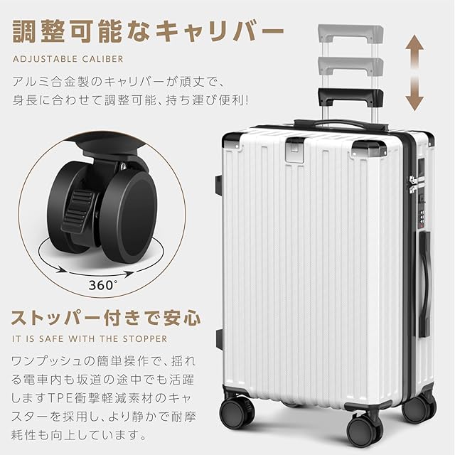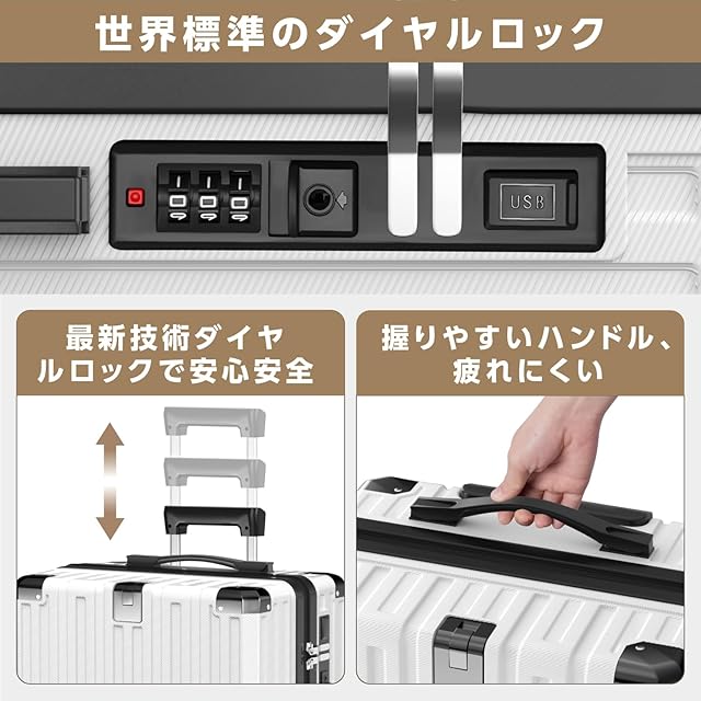 【2025新モデル・多機能】2025年に高品質スーツケースが新登場!スマホやタブレットに充電できるUSB&Type-C充電ポート付き、隠しフック付き、外出先でバッグや小物を掛けるのに便利です!折り畳み式のカップホルダーも飲み物容器を置くことができます。ストッパー(ブレーキ)機能でピタっと自立。乗降時や座席の離着席時などではすぐにストッパー解除ができるのでスムーズに移動を再開することができます。レバーの上部にはスマホルダーが付いているので、フライトの待ち時間に両手が自由になり、外出先でもリラックスできます。世界基準のダイヤル式ロックが搭載されて、外出がより安全に。