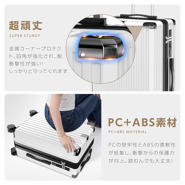 【耐衝撃・丈夫かつ軽いPC素材&ABS素材】表面素材は高耐衝撃性を持つPC(ポリカーボネート)+ABSを100%使用。樹脂は耐衝撃性・断熱材に優れる、ABS樹脂は軽くて弾力性と割れに強く高弾性で、変形しにくい。市販品より頑丈で耐久性に優れ、より軽量で持ち運びやすい。金属コーナープロテクト付きで、本体の四角が強化され、耐衝撃性が強い!しっかりと守ってくれます!