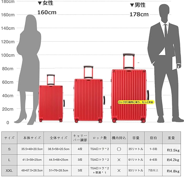 【サイズ】Sサイズの内寸は48*35.5*20.5cm、容量は35リットル、1~3泊に似合います。Sサイズは一部の航空会社だけに適用しますので、事前に航空会社に確認したほうがいいんです。Mサイズの内寸は50*38.5*22.5cm、容量は48リットル、2-4泊以上。Lサイズの内寸は41.5*58*25cm、容量は61リットル、4-6泊以上。XLサイズの内寸は62*45.5*26.5cm、容量は78リットル、5-7泊以上。XXLサイズの内寸は67.5*48*28.5cm、容量は93リットル、7泊以上