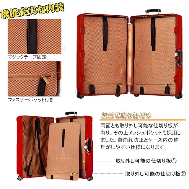 【内部収納に便利】トランクケースの収納能力が非常に高く、初心者の方から旅慣れた方まで幅広くご利用頂けるスーツケースです、耐久性には優れて丈夫です、長持ちできます。それから、荷物を固定するクロステープがあります。仕切り板も荷物のこぼれる事故を防ぎます。大容量の時にキャリーで安いです。