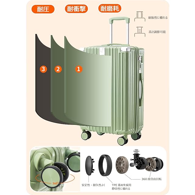 ロック付き・静音キャスター≫○暗証番号(自由に設定可能)により、確実にロックされます。○360度回転、静音仕様のダブルキャスター、音を抑えながら滑らかに運べるため、夜中や住宅街でも周りを気にせず移動できます。