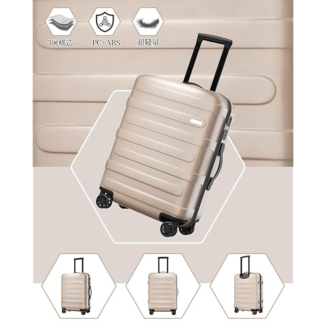 【超軽量で耐圧力がいい】 人気のABS樹脂+PC(ポリカーボネート)樹脂を採用しており、耐衝撃性や丈夫さなどの各方面の機能性がアップしています。PC素材の耐圧縮性、弾力性に優れており、スーツケースは高いところから落ちるても、重いもので押せられても、元の状態を維持することができます。横縞デザインにより、傷を防ぐことができます。超軽量ですから海内外のトラベルやビジネス出張に便利です。