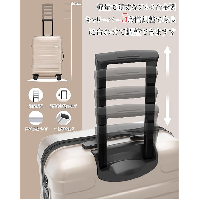 【5段階調整可能キャリーバー】超軽量のアルミニウム製キャリバー、最大5段階調整可能、ご自分の身長に合わせてスムーズに調整が可能です。耐振性に優れるデザインで荷物を引きかける時、しっかりしています。さらに、弊店のスーツケースは人間工学に基づいたハンドルのデザインで、長時間持っていても疲れません。