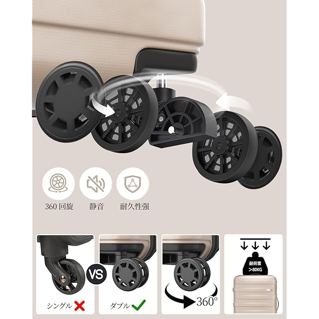 【耐衝撃静音ダブルキャスター】高弾性TPE衝撃軽減素材のキャスターを採用し、安定感のある8輪キャスターは高弾性TPE衝撃軽減素材のキャスターを採用し、360°回転で方向転換もラクラク。横にピタッと付けて歩いても、引っ張って歩いてもスムーズに移動できます。キャスター部に特殊な材質を採用しアスファルト上でも回転摩擦音を低減しました。また、X型ベルトが搭載され、荷物崩れを防着ます。
