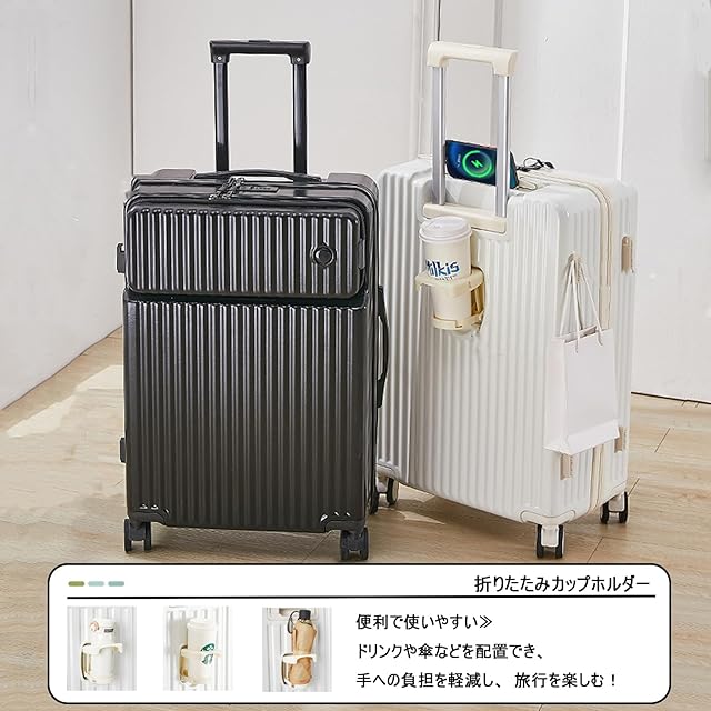便利で使いやすい≫○USBポートを搭載しているため、スーツケースを開けることなく充電しながら持ち運び可能。○サイドフックやカップホルダーが搭載され、ドリンク、傘、バッグなどを配置でき、手への負担を軽減し、旅行を楽しむ!注意事項≫XSとSサイズは小さいため、側面の持ち手とサイドフックがキャンセルされました。