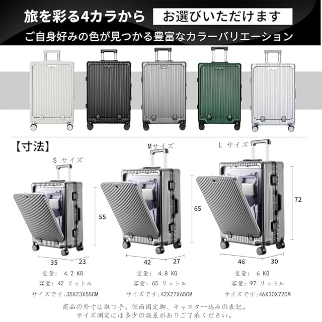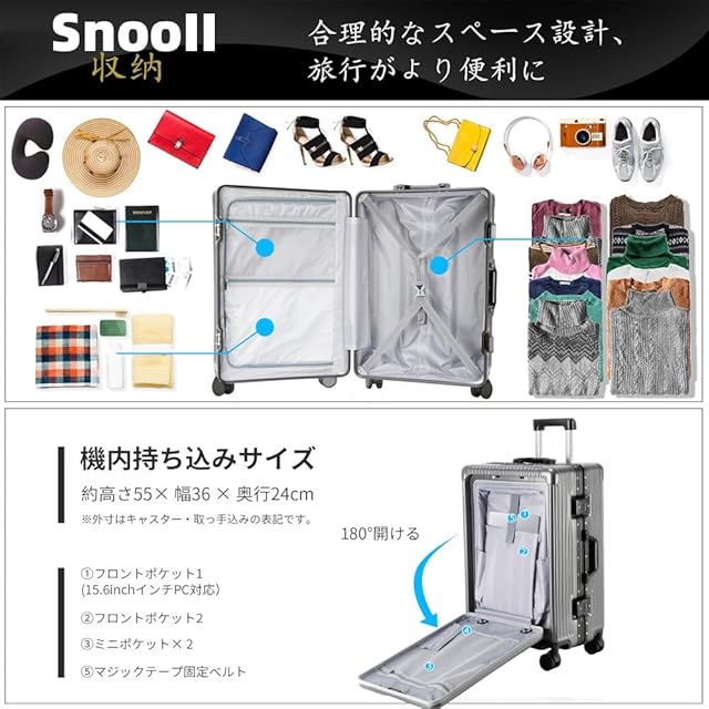 【前開きポケット&USB充電ポート付き&スマホスタンド機能】大きく開き 取り出しやすい!ジッパーを開ける必要がなく、1秒で素早く開く!立てたまま荷物の出し入れができる便利なフロントオープンスーツケースです。13インチ/15.6インチまでパソコンやタブレット、パスポートなど荷物に合わせた細かなポケットがあり、空港や新幹線の中、旅の途中でも、前ポケットから出したいものを簡単に取り出すことができ、子連れの方やビジネスシーンでも活躍しています。便利なUSB充電ポート付き、場所を選ばずいつでもどこでも移動しながら効率よく充電ができます。
