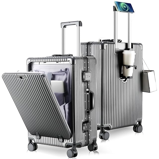 [SnooII] スーツケース 機内持ち込み 多機能フロントオープン キャリーケース ストッパー付き 携帯スタンド USBポート付き カップホルダー付き 隠しフック機能 超軽量 耐衝撃 静音 360度回転 ダブルキャスター アルミフレーム ピュアPC材質 大容量 TSAロック搭載 旅行 ビジネス 出張 (グレー, Lサイズ /97L (7泊~長期旅行))